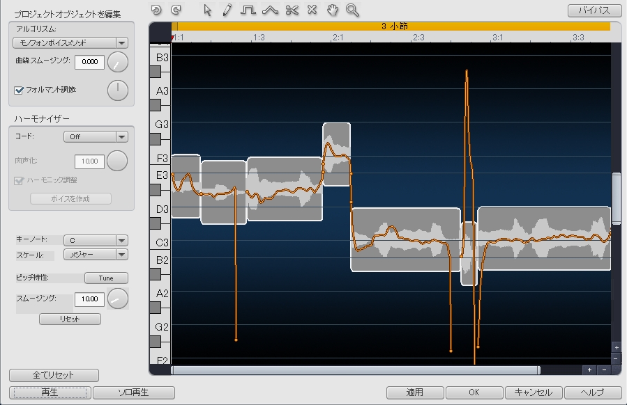 今回は、トーキングソフトの音声を「Music Maker2」内蔵の「エラスティック・ピッチチューン」を使って加工してみた。
